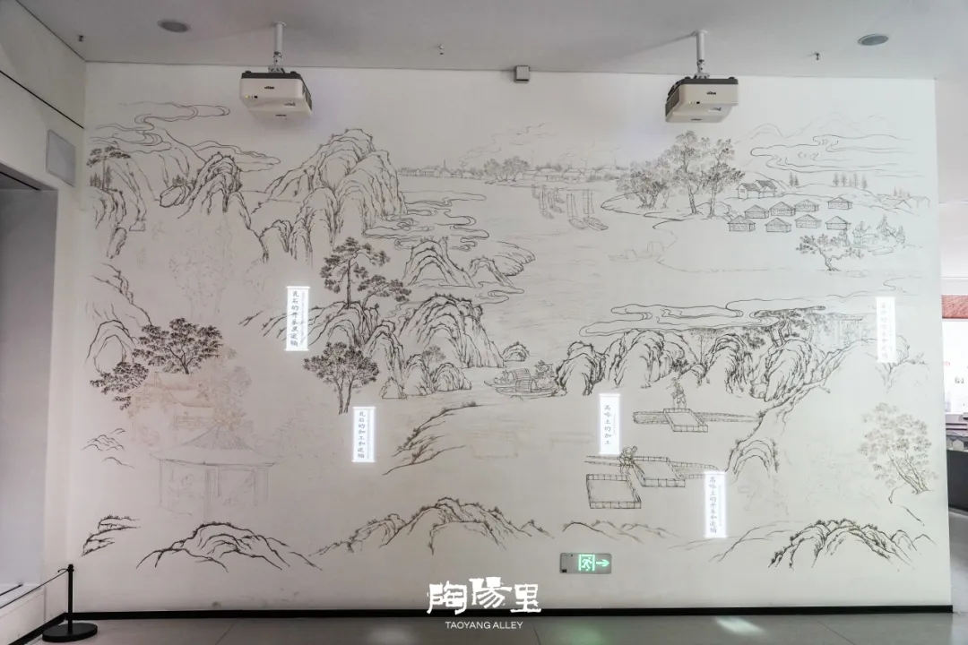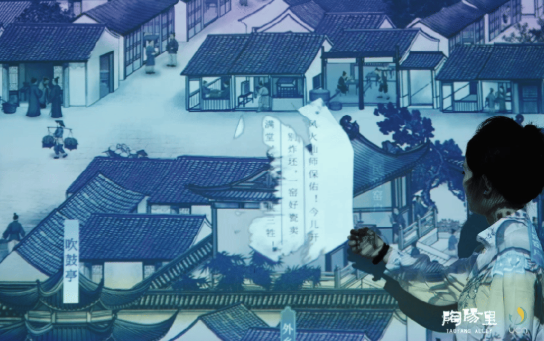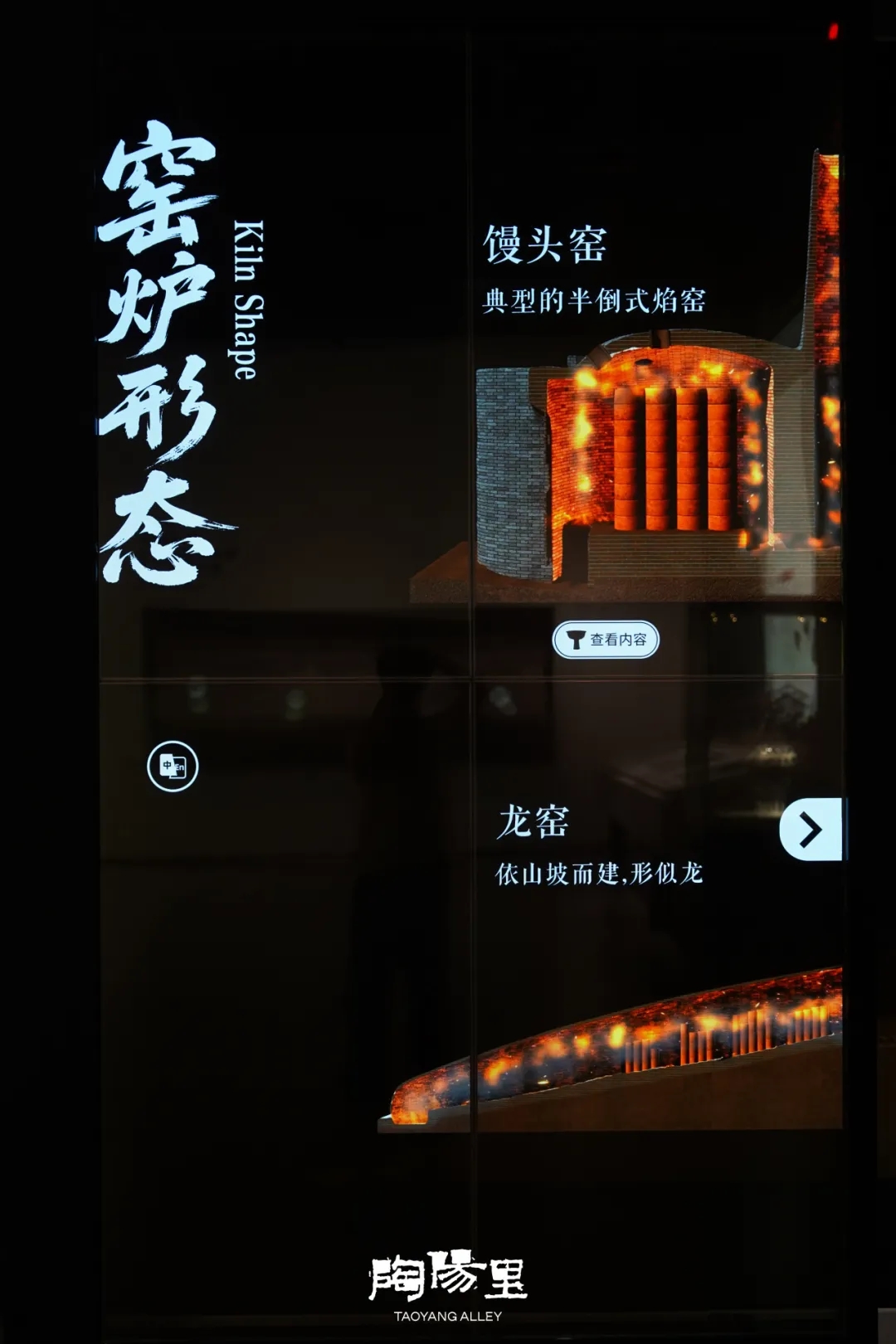 再往里走,点击墙上文字,墙面投影与触屏联动技术让唐英《陶冶图说》里的开采高岭土、瓷石等工序“活”起来,变成动态动画。