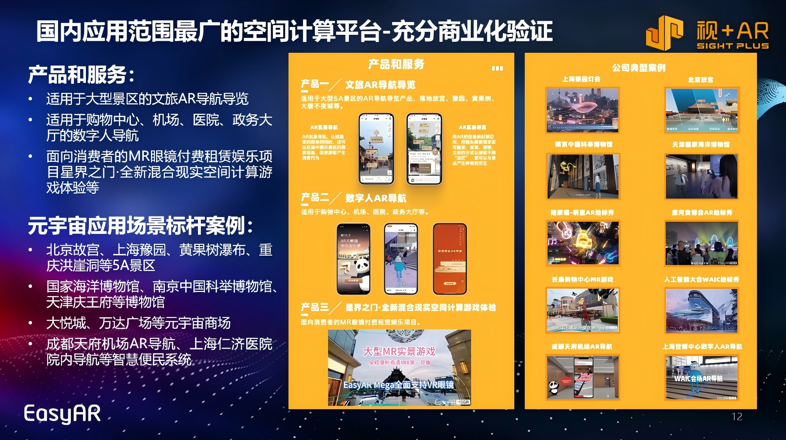 EasyAR在全球有20多万开发者,其中40%来自海外,提供稳定的建图、定位能力和完善的工具链,载体包括APP、小程序和AR/MR眼镜;产品包括景区AR导航导览,适用于购物中心、机场、医院等的数字人导航和MR大空间多人互动游戏体验(MRLBE);空间点云数据已经覆盖全国几十个城市,上千个地标,打造了豫园AR灯会等标杆案例,入选了工信部、文旅部等国家五部委发布的2023年VR先锋应用案例,2025年7月,入选上海市经信委、文旅局、教委、卫健委-首批15家元宇宙场景应用推广案例和2025世界人工智能大会(WAIC)中国智慧·上海方案“AI+文旅”十大优秀案例;9月,成功跻身中国-东盟AI+文旅创新应用大赛创新赛道六个获奖项目之一,斩获三等奖。此外,EasyAR作为专业AR工具写入我国数字媒体专业的高等教育教材《虚拟现实和增强现实技术基础》。