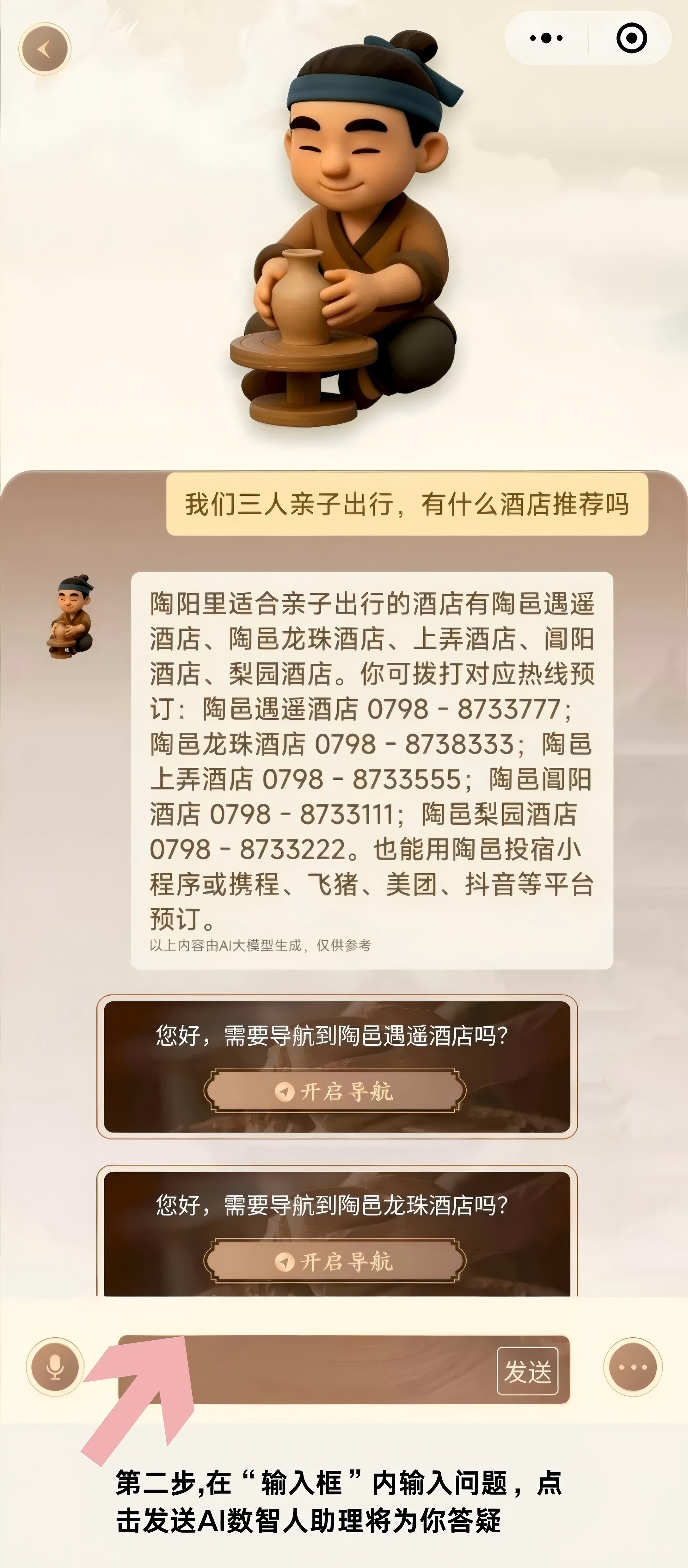 形成专属知识库,通过语音、文字等交互方式,为游客提供个性化、全场景的旅行陪伴服务。输入旅游区相关问题,比如景点导航、餐饮住宿、文化典故等,AI助理会给你细心解答,让整个游览过程更高效、更具沉浸感。