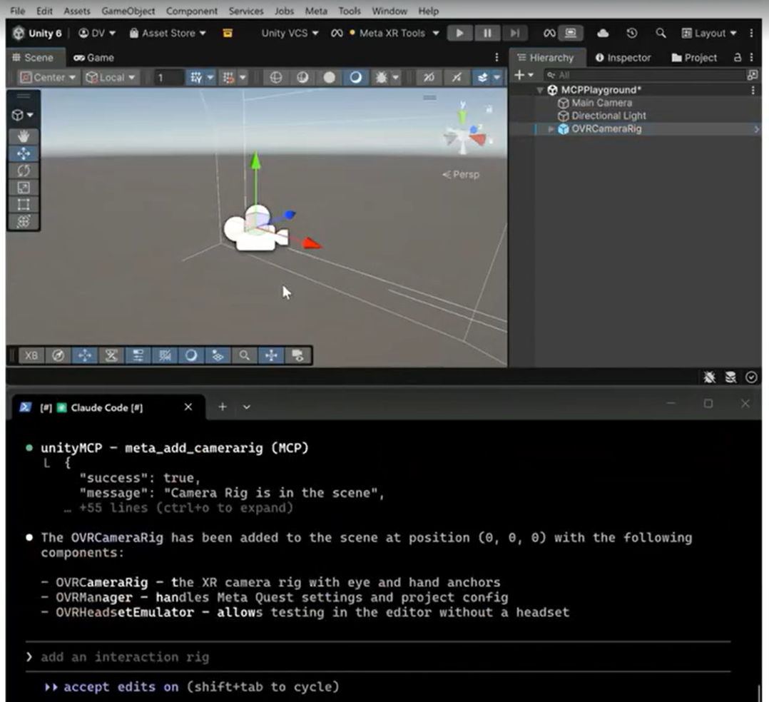 该分会场最引人注目的部分可能是工作流的流畅程度。Valecillos给Claude Code提供了一个简单的提示:添加一个交互rig,一个按比例缩小到10%的可抓握物体,激活XR模拟器,并播放Unity场景。智能体通过调用正确的工具、更新场景并进入播放模式来执行请求。这种简化功能看起来很新颖,但我们相信这将是开发者加速其开发流程的方式。当日常设置工作实现自动化时,团队可以将更多时间花在重要的游戏设计决策上。