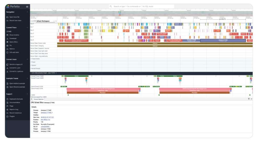 为什么选择Perfetto?团队称它是首选性能分析工具,这很有道理。它能快速回答你的应用是受CPU还是GPU限制,全面查看系统上运行的每个线程,并在追踪瓶颈时能够聚焦于单个帧。它还将CPU和GPU事件整合在一个时间线上,使得查找可优化的地方变得更加容易。