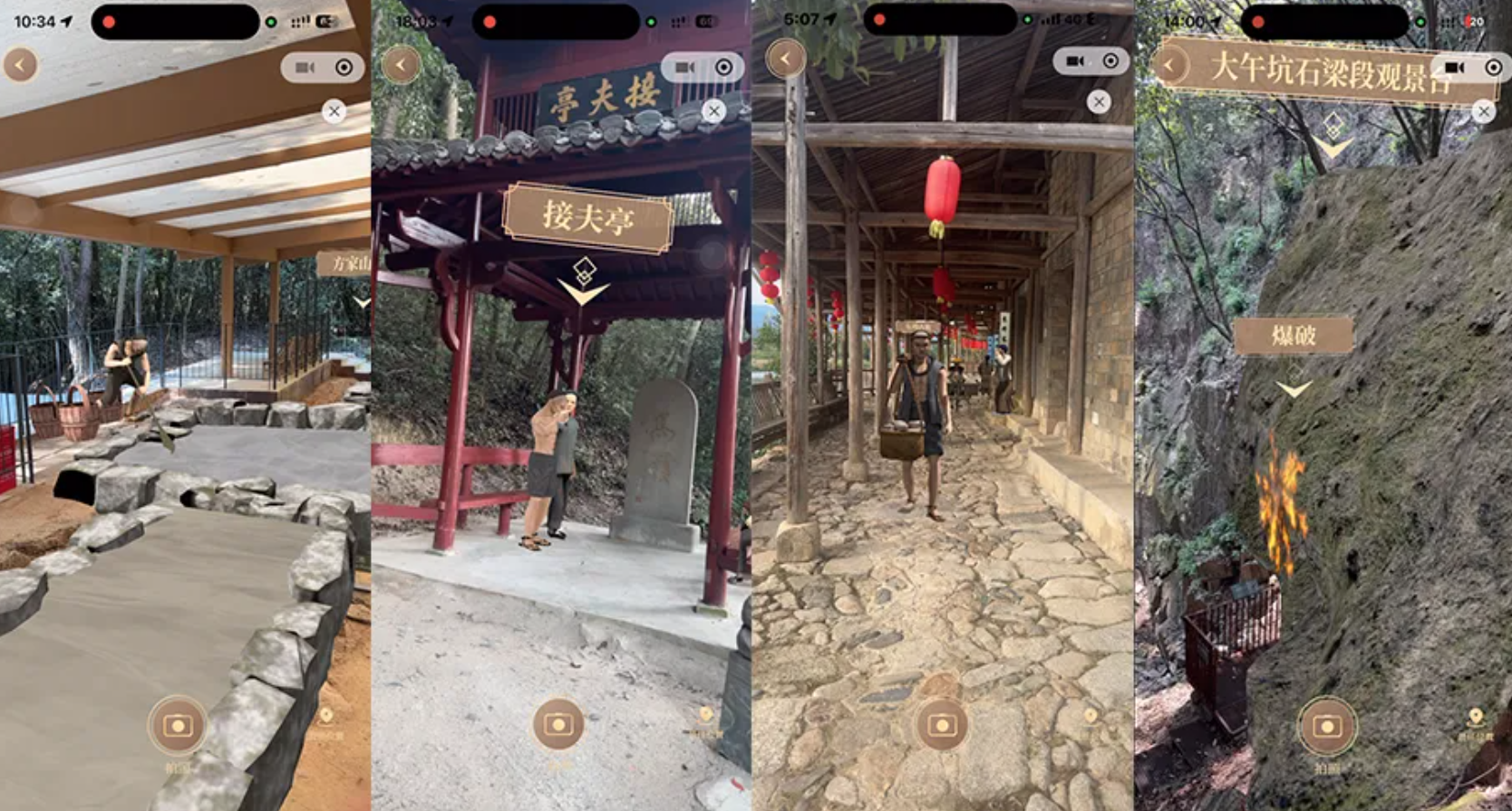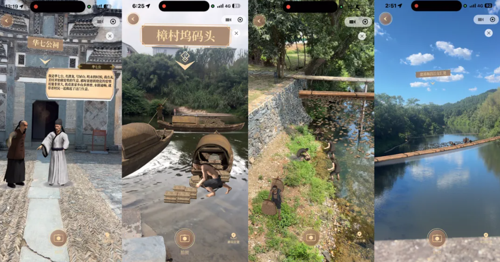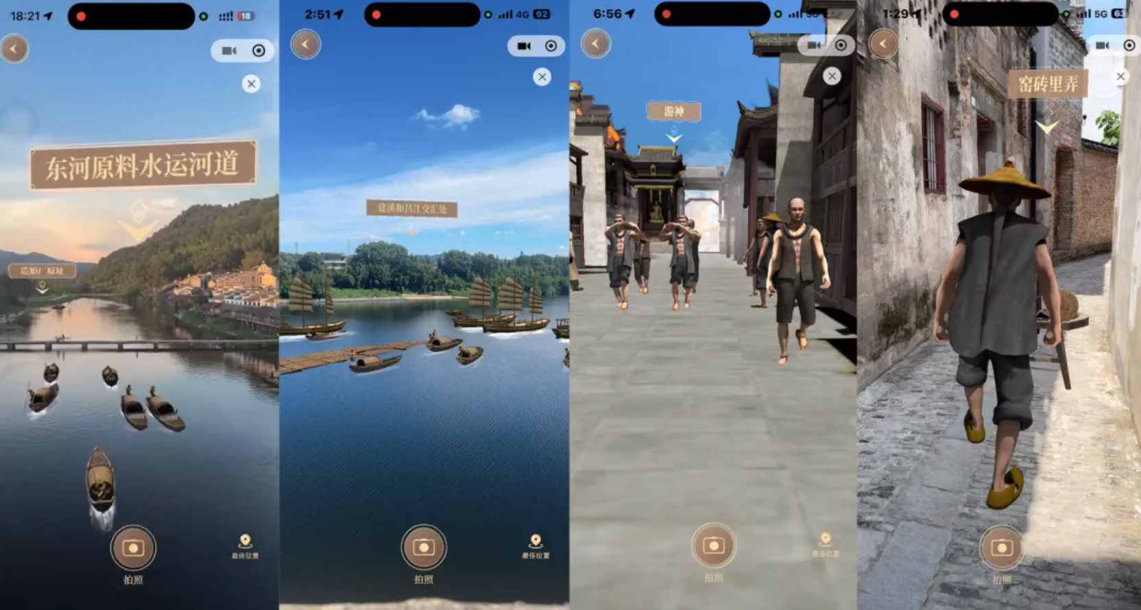 瑶里镇高岭村的高岭瓷土矿遗址,是明清最负盛名的高岭土原料产区,241.1 公顷的范围内,高岭土矿遗址与东河原料水陆运输遗存相映成趣。6 处 AR 场景细腻还原这里的岁月:高岭土矿遗址中,淘洗加工的工艺随 NPC 的温情对话缓缓展开,乡土人群的生活生产方式跃然眼前;东河沿岸的码头、古街与水运河道,承载着原料转运的繁忙记忆,挨个出镜,俨然像看了部《瓷土变形记》。
