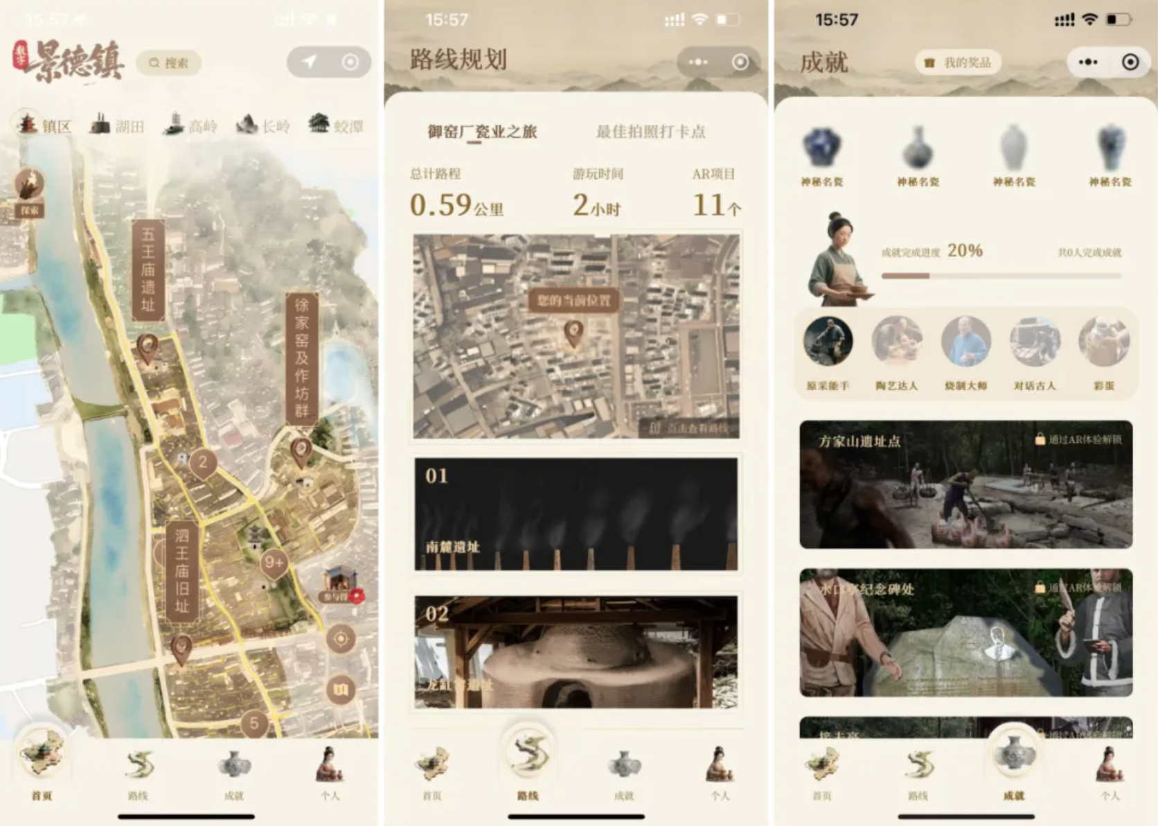 近2000公顷的景德镇手工瓷业遗存,从镇区的瓷业生产中心CBD到湖田古瓷窑址的青白瓷故里,从高龄瓷土矿遗址的原料仓库到长岭瓷石矿遗址的采石基地,再到蛟潭窑柴燃料产区的柴火补给站,AR 技术如细密丝线,将散落的文化遗珠串联成完整脉络。