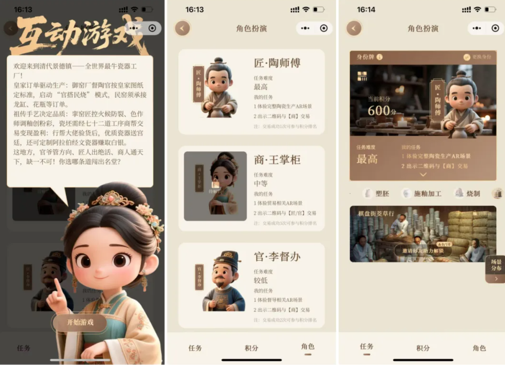 你可以选择化身匠人、商人或督官,亲历制瓷的精密工序,体验瓷运之路的艰辛,在充满趣味的任务中解锁知识。历史不再是书本上的字,而是你亲身干过的事。