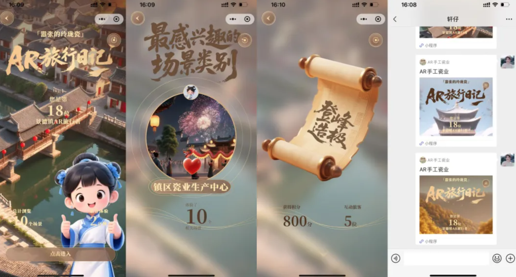 旅程尾声,AR旅行日记将自动为你生成独具故事感的电子档案与文化海报。一键分享至社交网络,即可从文化的体验者,自然转变为记录者与传播者,让景德镇的窑火生生不熄,匠心继续温柔岁月。