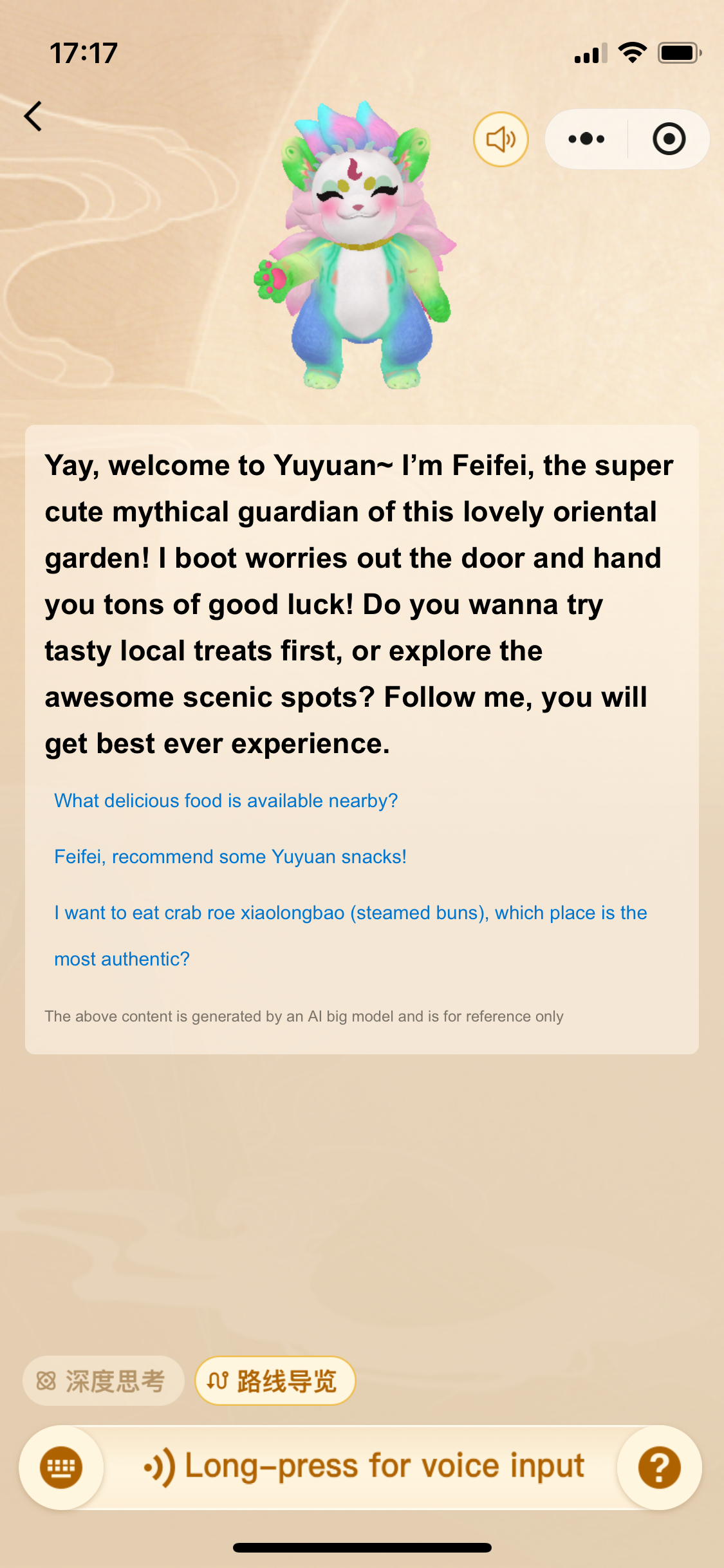 在这个万事要@AI的时代,朏朏当然也做了精心的准备。你只管张口问,从建筑到美食,从趣闻到路线,无论是中文,还是英文,朏朏这个“懂美学、知人情”的随行良伴,都能让不同文化背景的人听懂豫园的“心跳”。