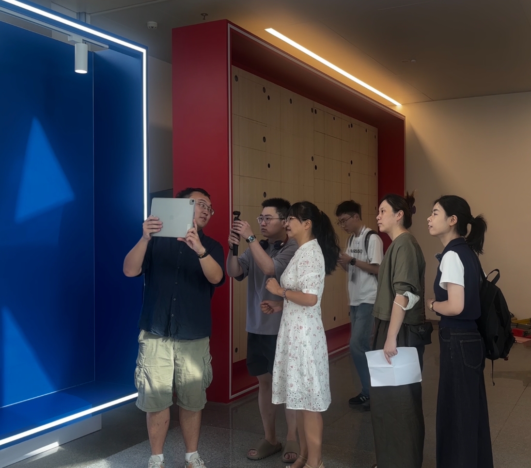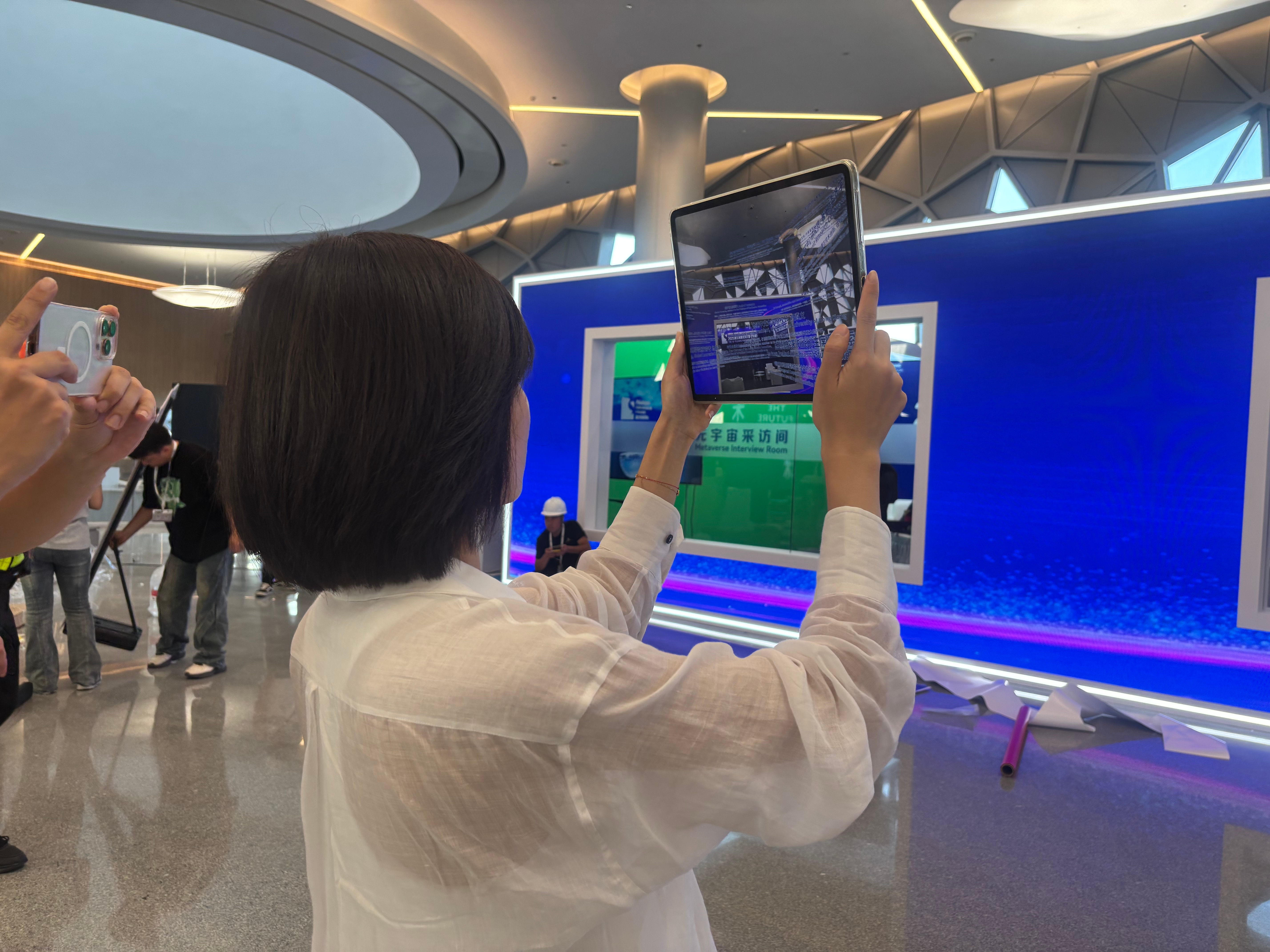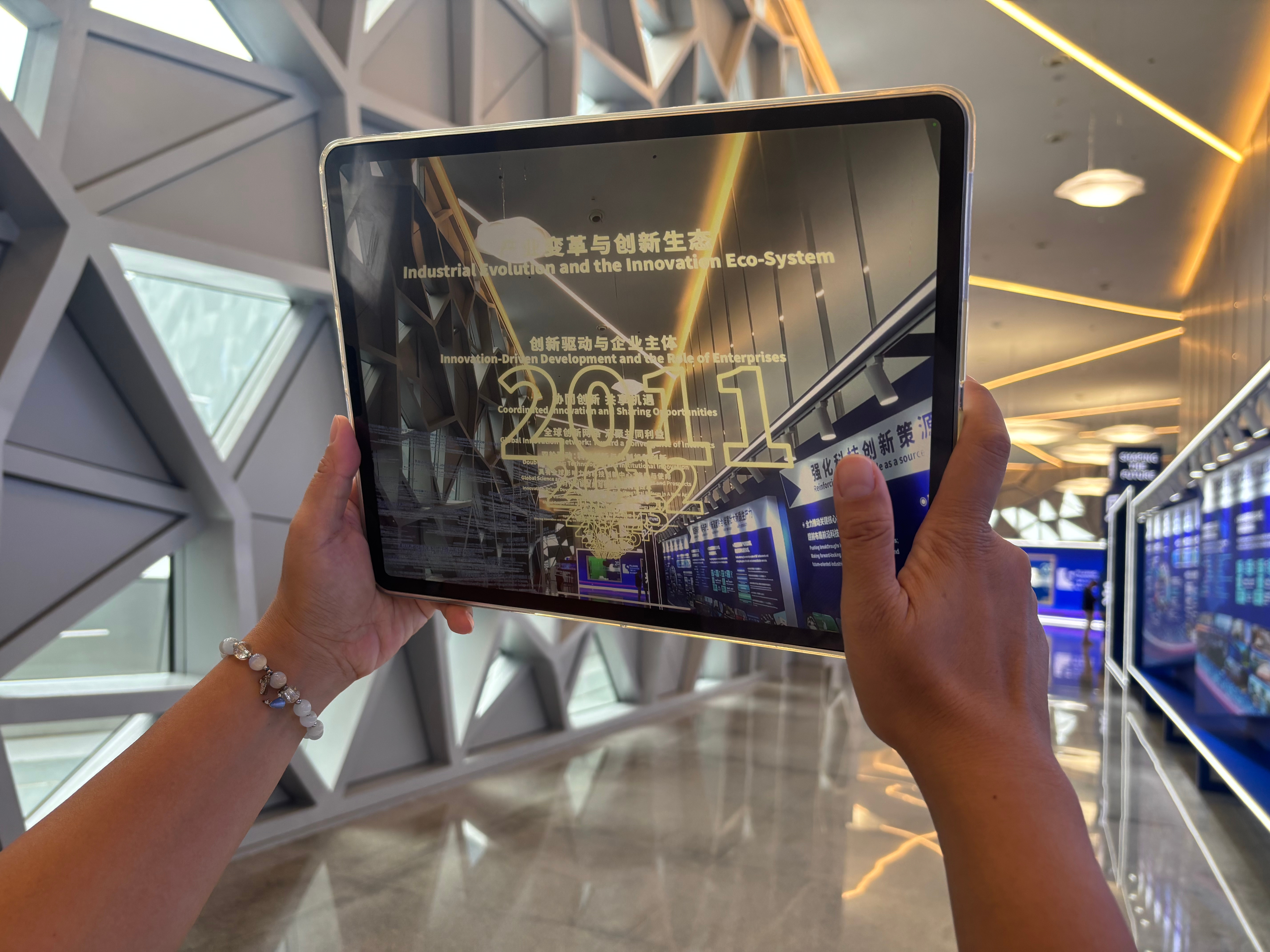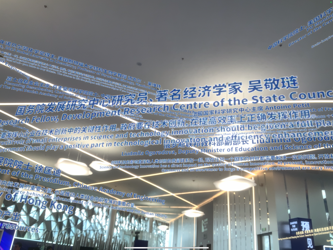 论坛现场,「基于空间计算的AR技术」创新思想殿堂独特的沉浸式体验吸引众多观众与媒体记者驻足探索,其中上观新闻(解放日报)、快看上海(上海电视台)等主流媒体记者更是率先亲身体验,感受AR技术与浦江论坛的深度融合。体验过程中,记者们手持平板,打开视+AR专属APP,缓步走进论坛现场的阳光走廊。随着脚步移动,空间计算技术精准捕捉位置变化,历年浦江论坛的核心主题清晰地浮现在屏幕之上;同时,往届演讲嘉宾的经典名句以动态文字形式环绕呈现,仿佛穿越时空与过往的创新思想对话。阳光透过走廊玻璃洒在屏幕上,虚实画面交织,让抽象的论坛记忆变得可触可感,记者们不时停下脚步,细致观察画面细节,并用镜头记录下这一独特场景。