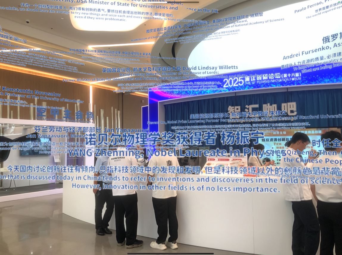 随着目光的抬升,诺贝尔物理学奖获得者杨振宁先生在2008年首届浦江创新论坛发表演讲时的箴言夺目而出:“今天国内讨论创新往往有倾向,只指科技领域中的发现和发明,但是科技领域以外的创新也是非常重要的。”这一瞬间,时空仿佛被AR技术折叠。眼前仿佛浮现出年逾百岁的杨先生端坐嘉宾席的身影,精神矍铄,目光清亮,依稀能看到,他缓缓抬手调整话筒,语调温和却掷地有声地说出这句发人深省的话。透过这句悬浮于空间的金句,杨先生身着深色西装的儒雅姿态、手握话筒时的沉稳气场,以及眼神中对“全面创新”的坚定期许,都愈发清晰。这份跨越时空的触动,不仅让观众直观感受到前辈学者的思想深度,更在虚实交融间传递出深刻启示:创新从不是科技领域的“独奏”,文化的焕新、教育的突破、制度的优化,同样是推动时代向前的重要力量,这份认知,也让浦江论坛的“思想交流”更具温度与厚度。