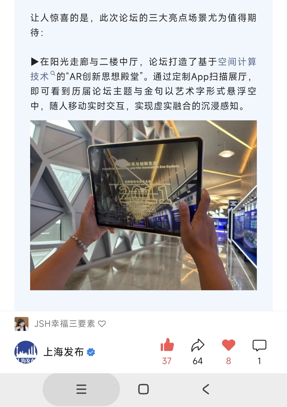 值得一提的是,“AR创新思想殿堂”也荣登“上海发布”,作为本次论坛的三大亮点场景之一进行了着重介绍。