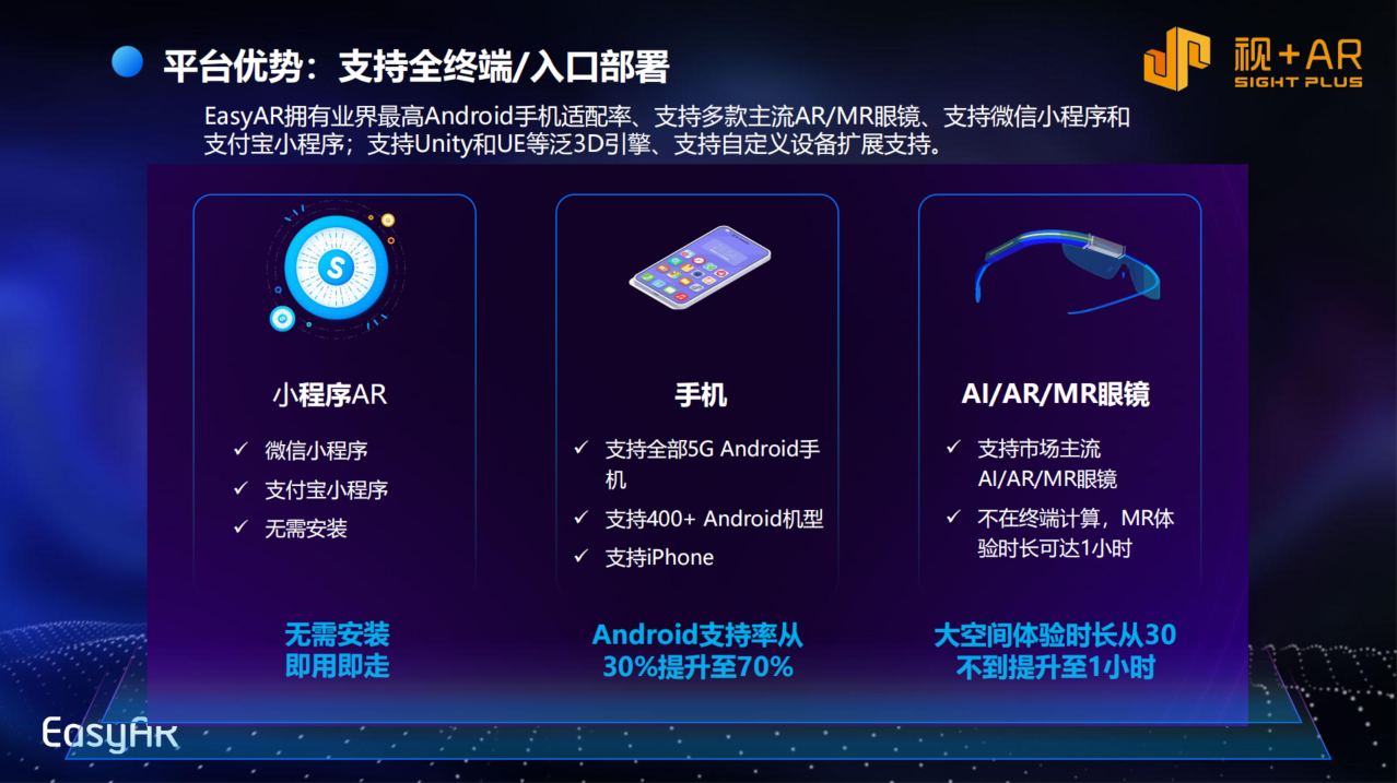 平台适配性更是贴合文旅场景需求:Android 手机适配率业界最高,支持主流 AR/MR 眼镜、微信与支付宝小程序,游客无需额外下载,扫码就能开启体验;还兼容 Unity、UE等3D引擎,可自定义扩展设备,满足不同文旅场所的个性化需求。