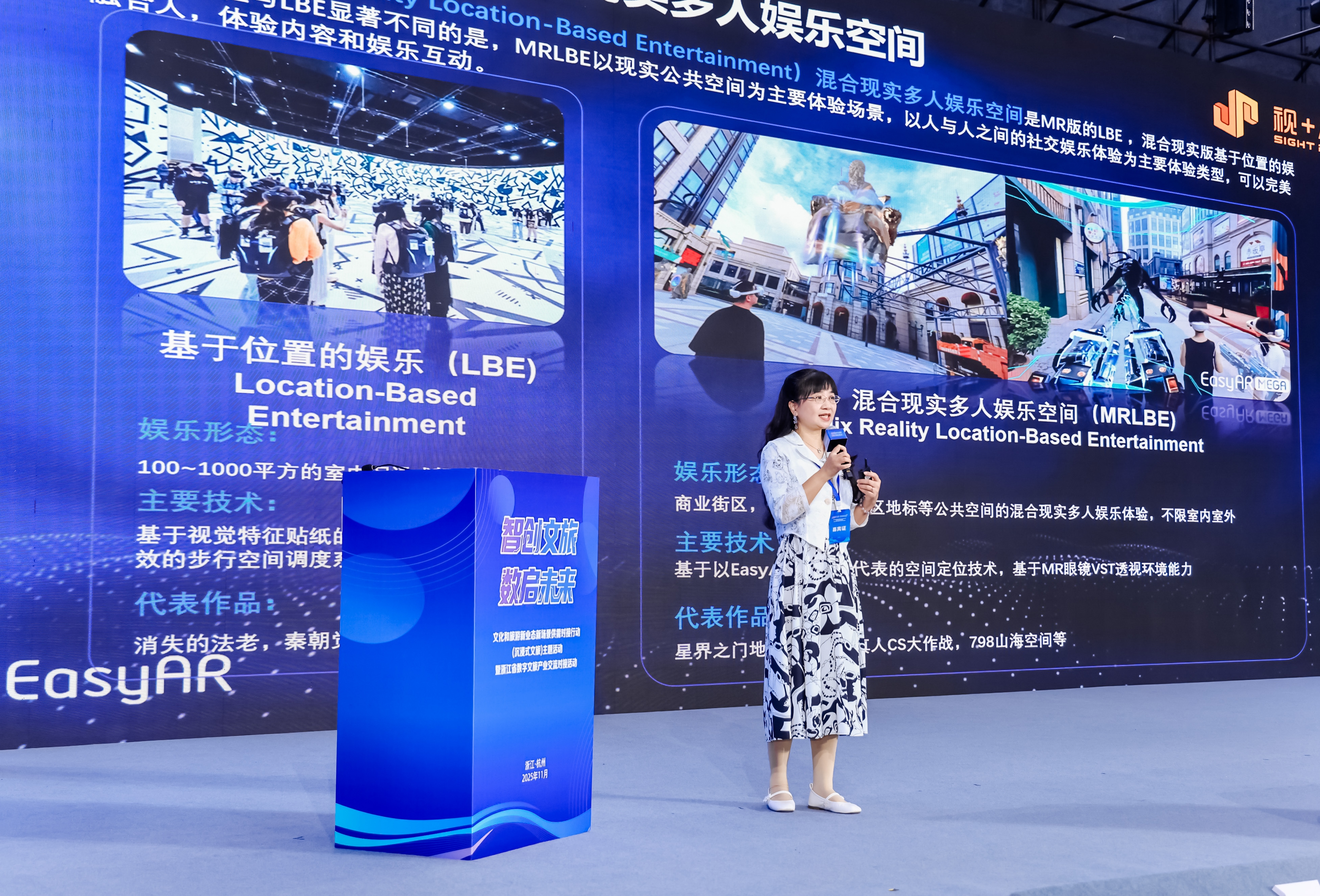 视+AR副总经理江淑红博士以“ EasyAR Mega 元宇宙空间计算平台与上海豫园 AR 灯会优秀案例”为核心主题展开深度分享。江淑红博士结合自身对行业趋势的精准洞察与项目实践经验,从技术底层逻辑、平台核心能力到落地应用价值,进行了全方位、立体化的讲解,全面展示了视+AR在推动文旅产业数字化转型方面的技术实力与创新实践。