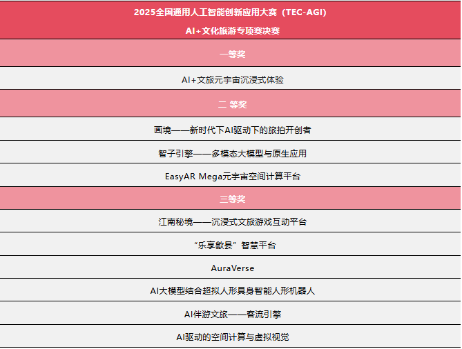 2025年11月28日,2025全国通用人工智能创新应用大赛(TEC-AGI)AI+文化旅游专项赛决赛在安徽歙县顺利举办,现场决出一等奖1名,二等奖3名,三等奖6名。