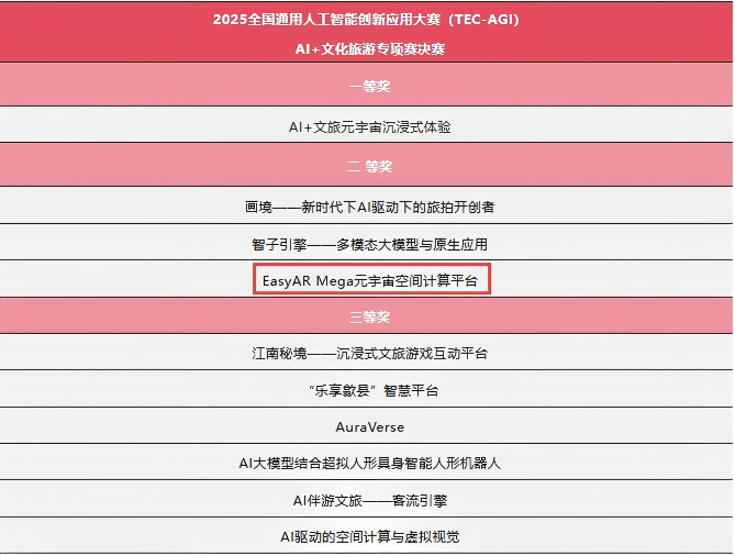 A1:2025全国通用人工智能创新应用大赛“AI+文化旅游”专项赛决赛共20个项目团队参与,并决出一等奖 1 名、二等奖 3 名、三等奖 6 名;其中EasyAR Mega 元宇宙空间计算平台获二等奖。
