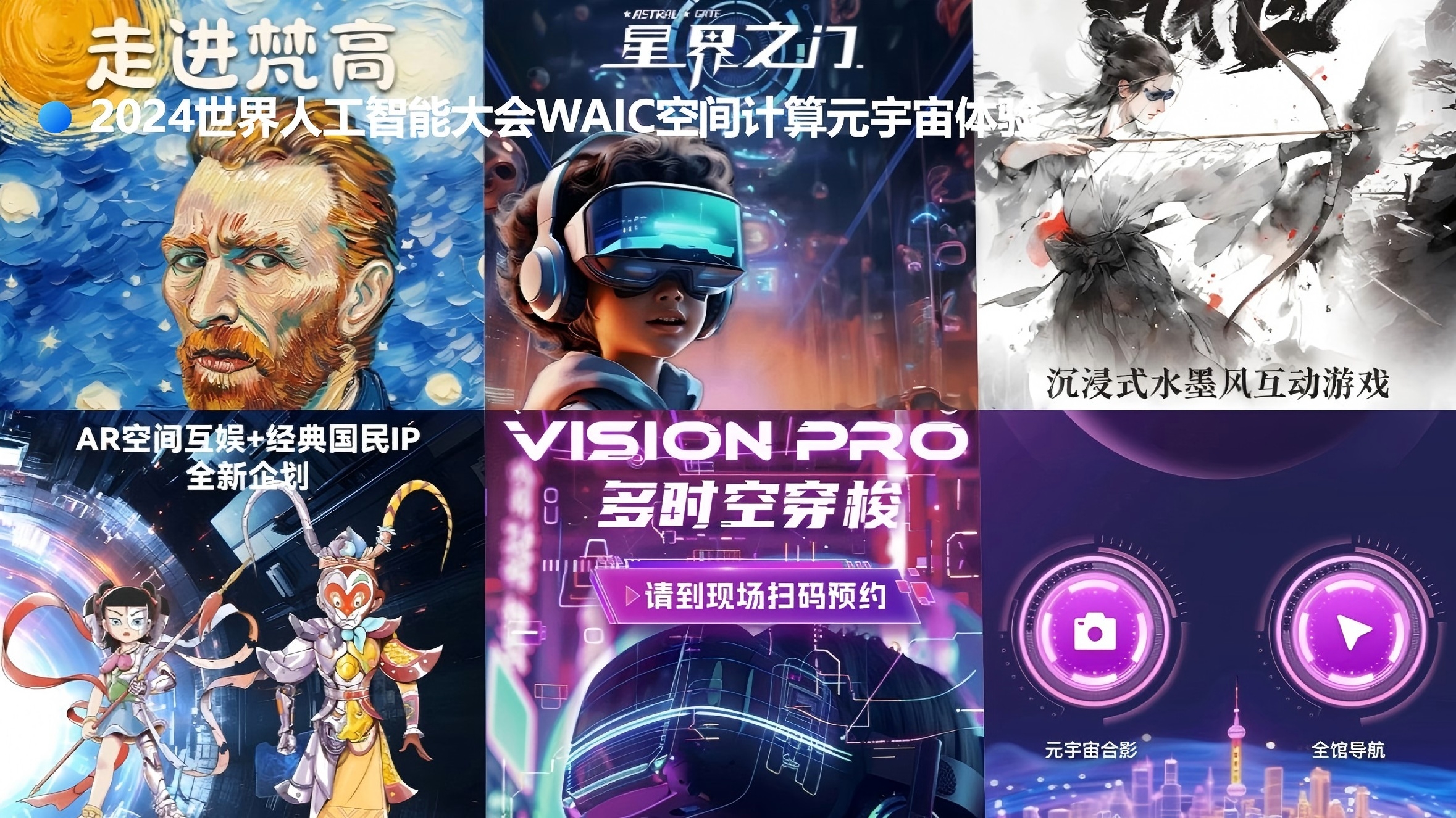 2024年WAIC期间,依托EasyAR空间计算技术,视+AR联合PICO、Rokid、歌尔创客等合作伙伴,共同呈现了“星界之门冰雪大作战”、“龙行弓影射箭”以及“走进梵高沉浸式画展”等元宇宙体验项目,观众排队热情高涨,是WAIC现场最热闹的几个展厅之一。
